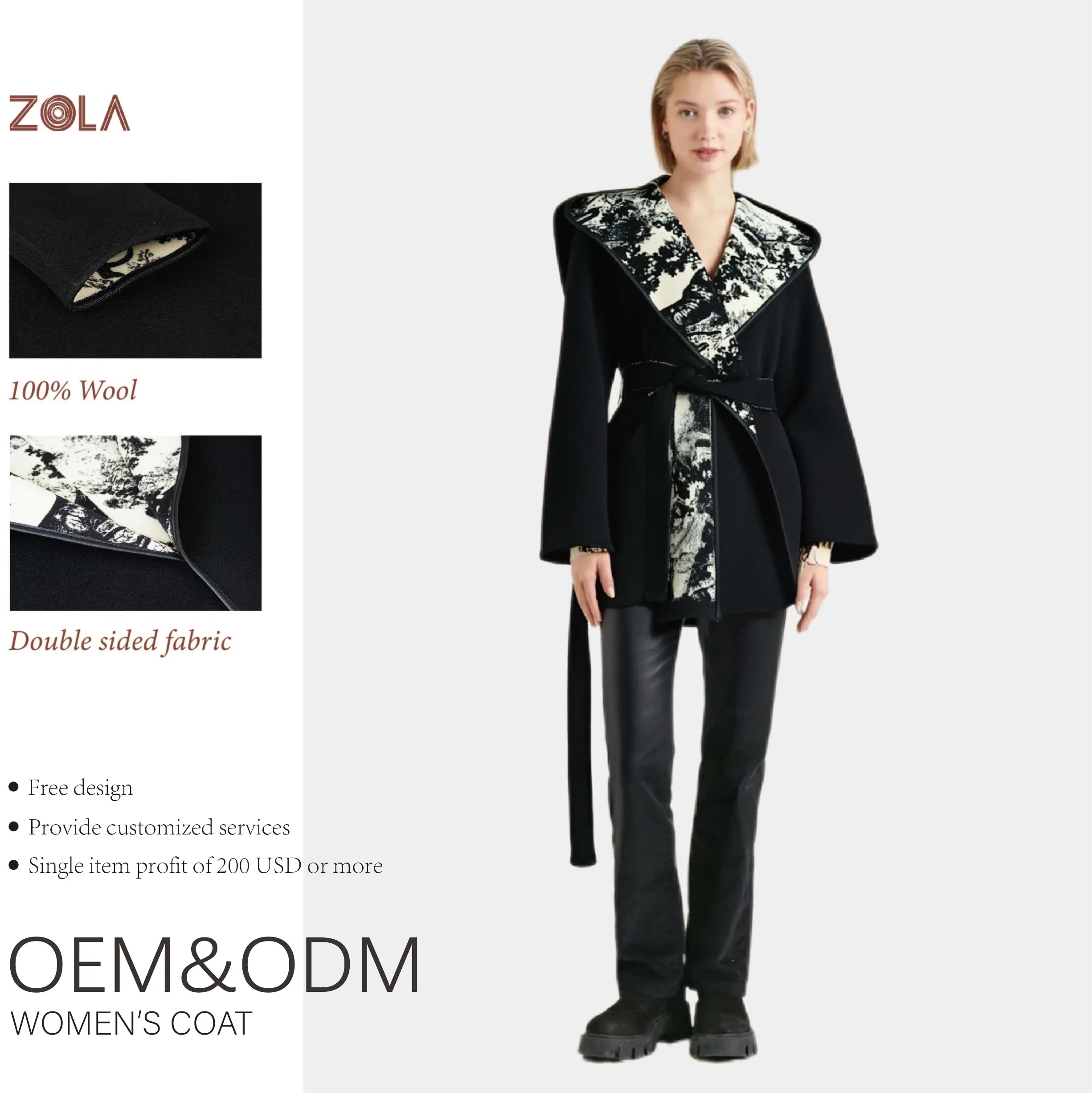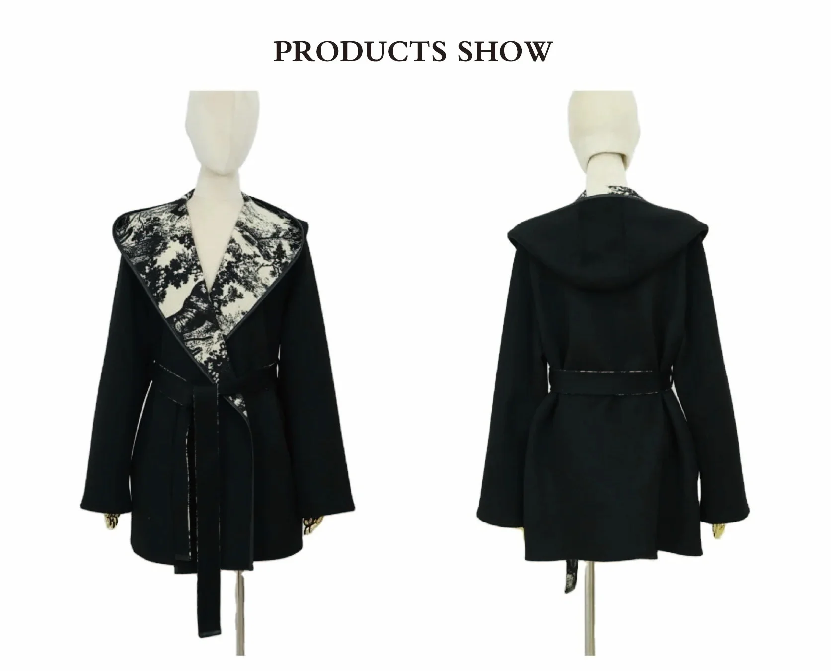 Women's Winter Wool Coats Short Straight Fashionable Casual Outerwear Hood Black Belt Closure Woven Fabric Designed Plain Dyed